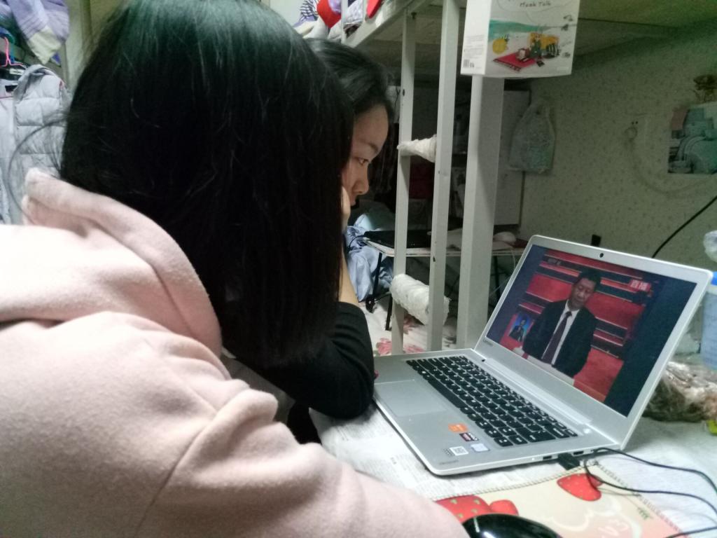 新闻专业的学生们利用空闲时间在宿舍关注两会,同学们反响热烈,纷纷表达自己的“两会心声”。“李克强总理在《政府工作报告》中指出‘使命重在担当,实干铸就辉煌’,新时代的大学生要关注国家的新思路、新理念和新举措,我们要更加努力地学习专业知识,积极参与社会实践活动,用青春、智慧和能力为祖国发展作出自己的一份贡献力量。”新闻151班班长黄向阳说到。