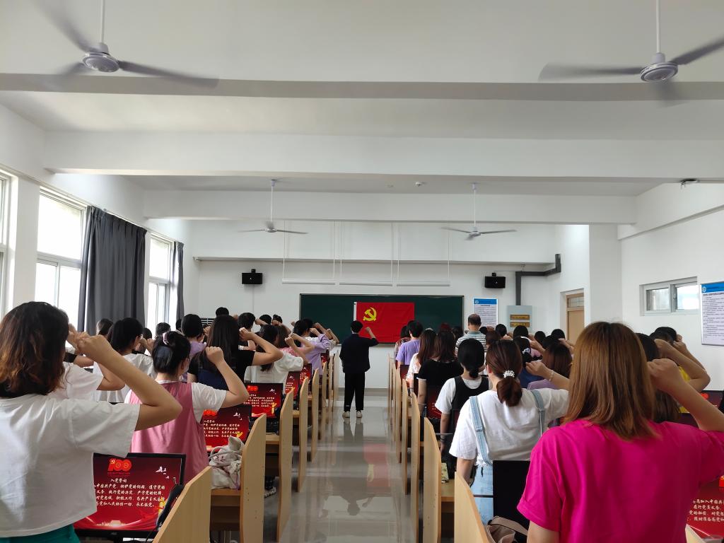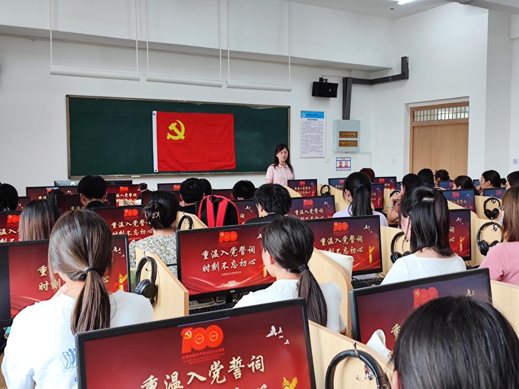 为庆祝中国共产党成立100周年,6月30日,外语系全体师生党员齐聚一堂,在第二教学楼513教室举行重温入党誓词活动。系党总支书记张帆同志主持。