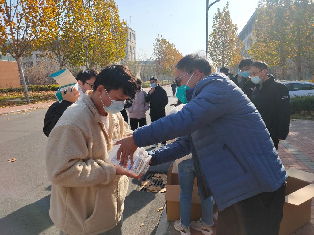 12月1日中午,在S4宿舍楼前,机电工程学院老师将防疫礼包逐一发放到学生手中,并叮嘱学生务必严格遵守疫情防控规定,调节好心情,注意保暖,安心备考,以最好的状态迎接考试。“向考研学生发放礼包是机电工程学院多年来的传统,希望同学们能够从中感受到学院对他们满满的关爱和美好的祝愿”,毕业生辅导员赵宁宁如是说。
