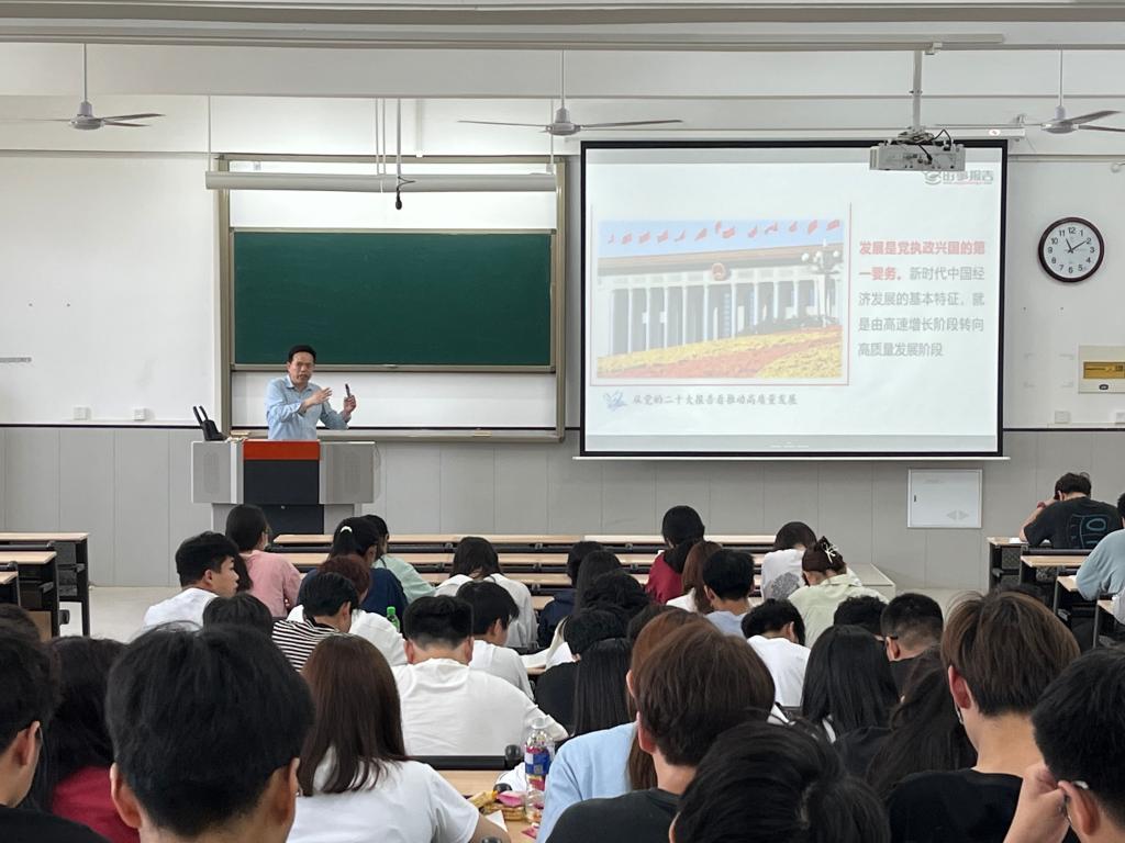 蒋红哲以“从党的二十大报告看推动高质量发展”为题,从关系全局的首要任务、深刻丰富的内涵要求、精准务实的战略部署三个方面,深刻解读二十大报告,帮助学生理解二十大精神,坚定为党奉献的决心。蒋院长讲到发展是党执政兴国的第一要务,质量是立业之本,强国之基,这些都关系到民生福祉。最后,他希望大学生应学习、理解、牢记二十大精神,将自身专业知识与社会实践互通互补,打牢一身本领,为中国建设添砖加瓦!