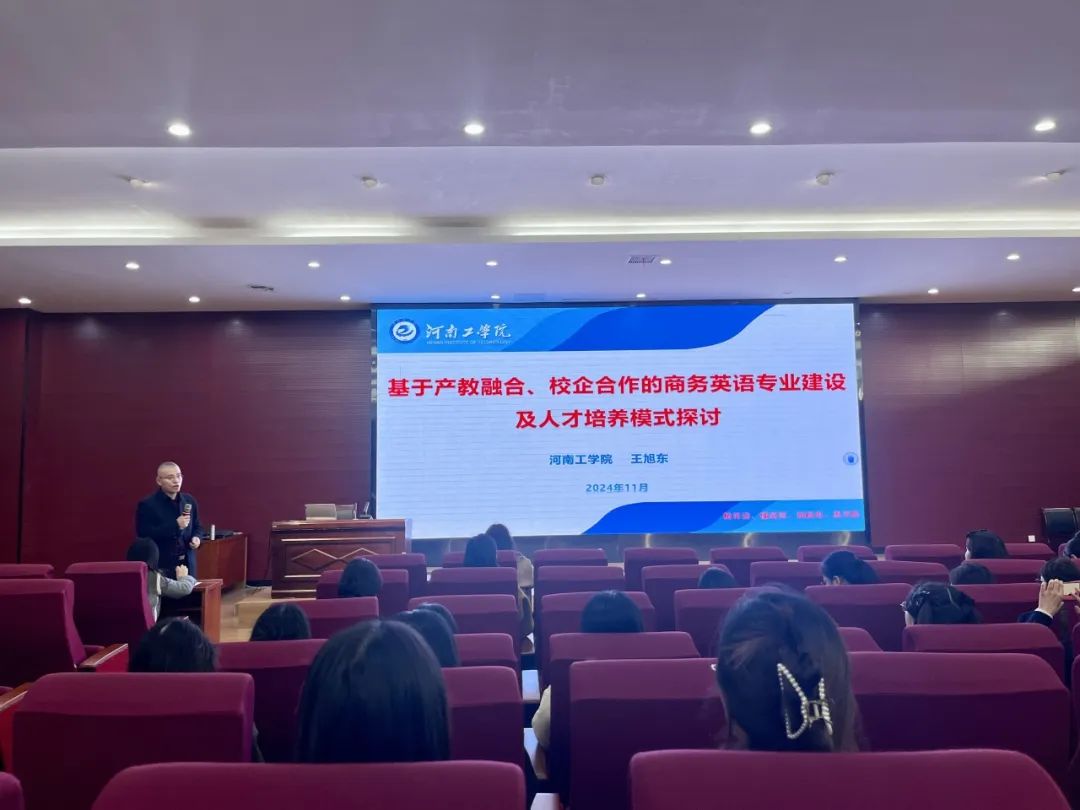11月7日下午,外国语学院于学院楼报告厅举行商务英语专业建设暨人才培养质量提升研讨会。此次讲座由副院长张帆主持,特邀新乡市科技特派员、河南工学院副院长王旭东副教授担任主讲嘉宾,外国语学院全体教师及2021级商英专业学生共同聆听。