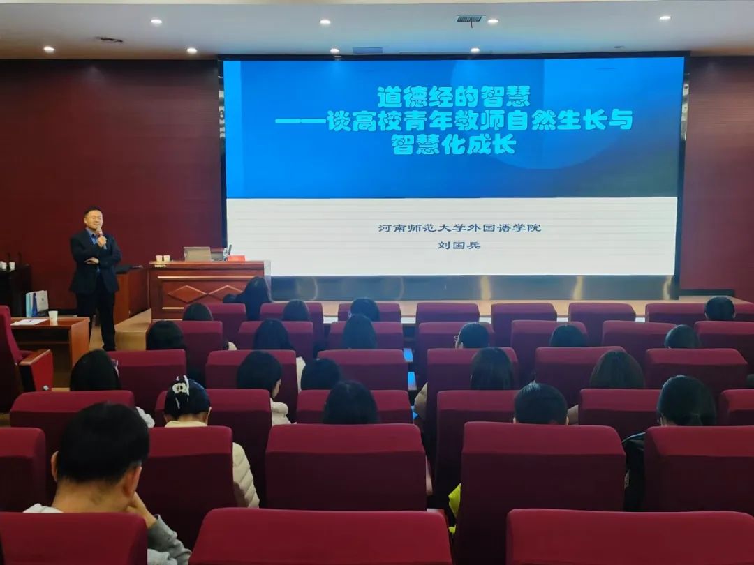 12月5日下午,我院邀请到河南师范大学外国语学院院长、博士生导师、河南省外事翻译语料库研究中心主任、河南省学位委员会第四届学科评议专家组秘书长刘国兵教授,在学院楼报告厅举办了一场题为“道德经的智慧——谈高校青年教师的自然生长和智慧化成长”的讲座。本次讲座由外国语学院院长梁晓冬主持,我院全体教师共同聆听了这场思想盛宴。