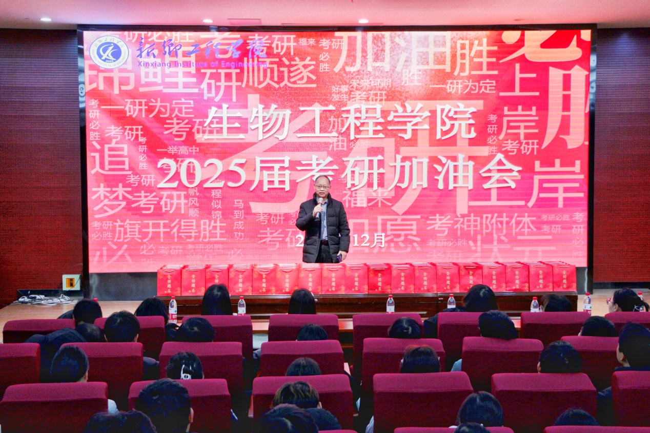 12月12日上午,生物工程学院在学院楼报告厅举行2025届考研冲刺加油会。院党委书记、院长牛立元教授出席会议并讲话,全体辅导员、各专业课教师代表、全体考研同学参加。