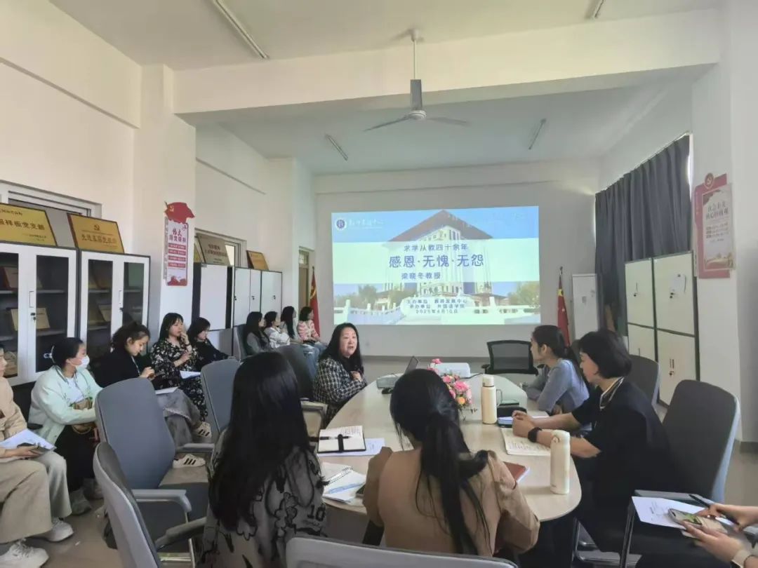 为激励教师秉持教育初心,提升师德修养, 4月10日,外国语学院在教2-402开展师德师风专题培训,此次培训以“感恩,无悔,无怨,求学从教四十余年”为主题,由外国语学院院长梁晓冬主持,英语师范专业教研室及公共外语教研室全体教师共同参与。