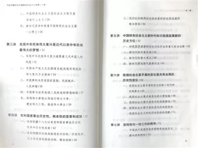 这三十个专题,每专题最少3节,最多8节。如,第四讲“党和国家事业历史性、根本性的变革和成就”,只有3节:全面把握十八大以来党和国家事业历史性变革和历史性成就;深刻理解历史性成就是全方位的、开创性的,历史性变革是深层次的、根本性的;充分认识取得历史性变革和历史性成就的根本原因。第二十九讲“努力掌握马克思主义思想方法和工作方法”,一共8节,分别为:坚持实事求是、坚持战略定力、坚持问题导向、坚持全面协调、坚持底线思维、坚持调查研究、坚持抓铁有痕、坚持历史担当 。