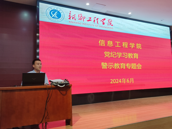 为深入学习贯彻习近平总书记关于全面加强党的纪律建设的重要论述,以党纪党规为尺,以典型案例为戒,持续深化以案说德、以案说纪、以案说法、以案说责,切实增强党员干部纪律规矩意识,进一步推动党纪学习教育走深走实,信息工程学院于6月14日上午在南校区学院楼报告厅召开党纪学习教育警示教育专题会议。会议由党委副书记李超主持,信息工程学院全体老师及学生代表参会。