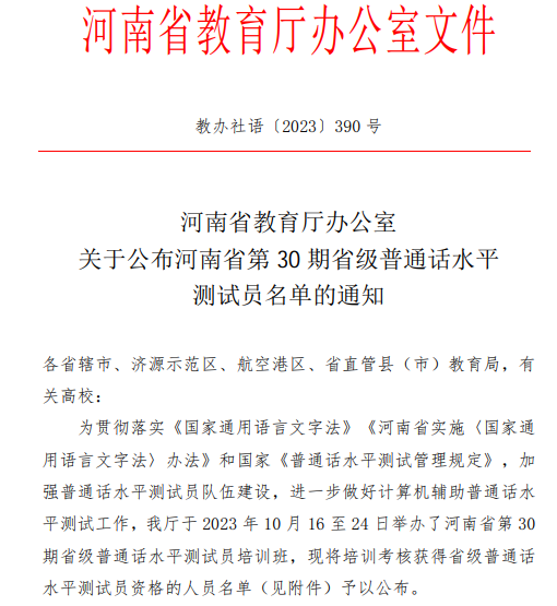 为深入学习贯彻党的二十大报告提出的“加大国家通用语言文字推广力度”和习近平总书记关于语言文字工作的重要指示批示精神,进一步加强全省普通话水平测试员队伍建设,10 月 16 至 24 日,河南省第30期省级普通话水平测试员培训班在登封举办,我校普通话培训测试站选派邢闻、申琳两位教师参加了培训。两位教师系统学习了普通话水平测试基础理论、测试等级标准和评分标准,经测试,两位参训教师普通话水平均达到一级乙等,并通过了测试能力考核,最终获得省级普通话水平测试员资格。