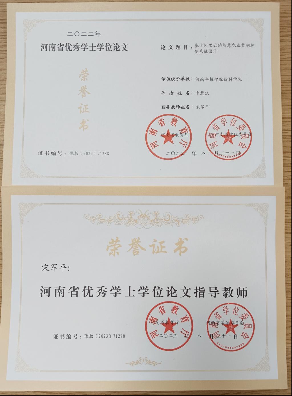 近日,河南省教育厅下发了《河南省教育厅 河南省学位委员会关于批准 2022 年河南省优秀学位论文的决定(教研〔2023〕310 号)》文件,我校《基于阿里云的智慧农业监测控制系统设计》等4篇学位论文荣获河南省优秀论文称号。