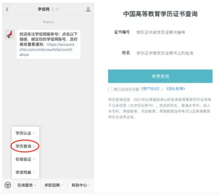 目前,学生可通过以下两种方式查询本人学历信息(以手机微信版为例):