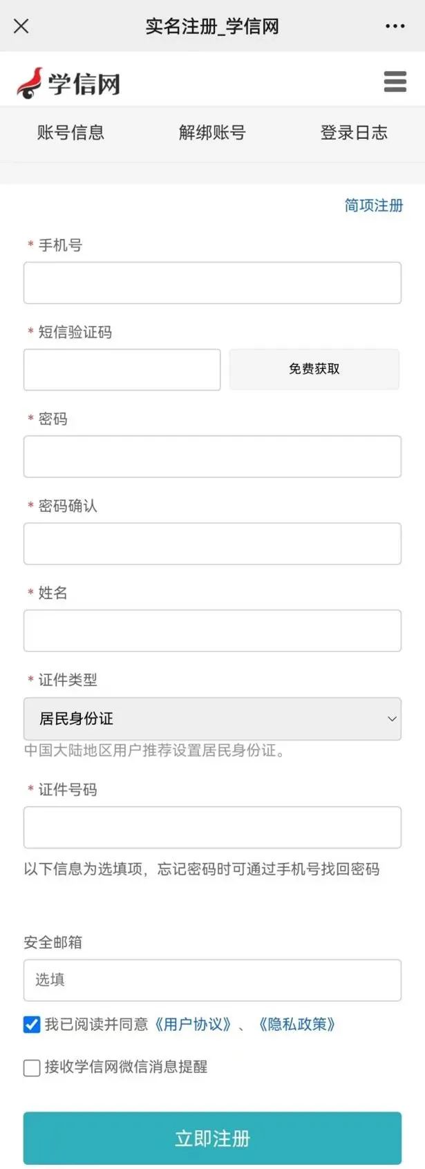 高校在完成录取新生学籍注册工作后,学生可登录学信网实名注册后查询、核实本人身份信息和学籍注册信息。首次注册流程如下(以手机微信版为例):