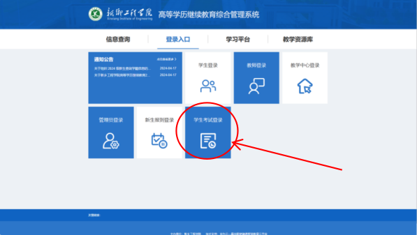 登录网址:https://xxgc.jijiaox.com/jw/index.html选择“学生考试登录”,输入学号、密码、验证码登录后,在“我的考试”页面,可以看到所有期末考试的课程,点击课程下方“进入考试”,进入考试答题,答题完毕,点击提交,考试结束。