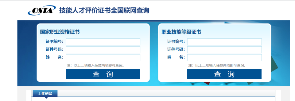 (4)近一年已取证的同学无法参与此次取证,可登陆此网址进行查询http://jndj.osta.org.cn/ ,左边查询职业资格证,右边可查询技能等级证。