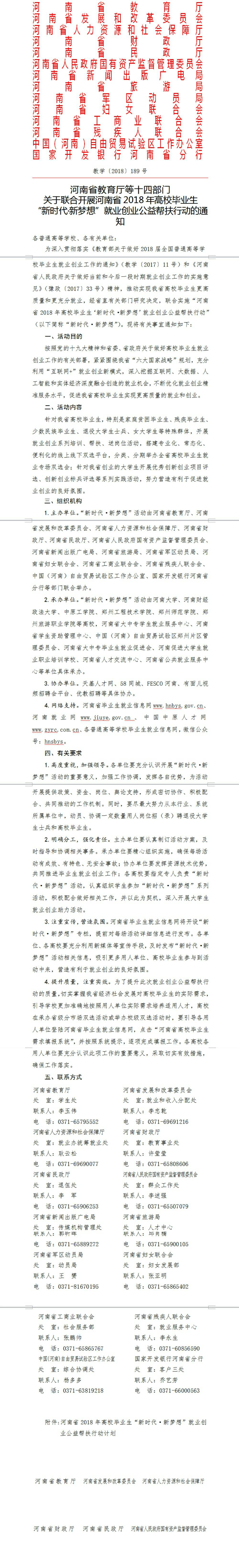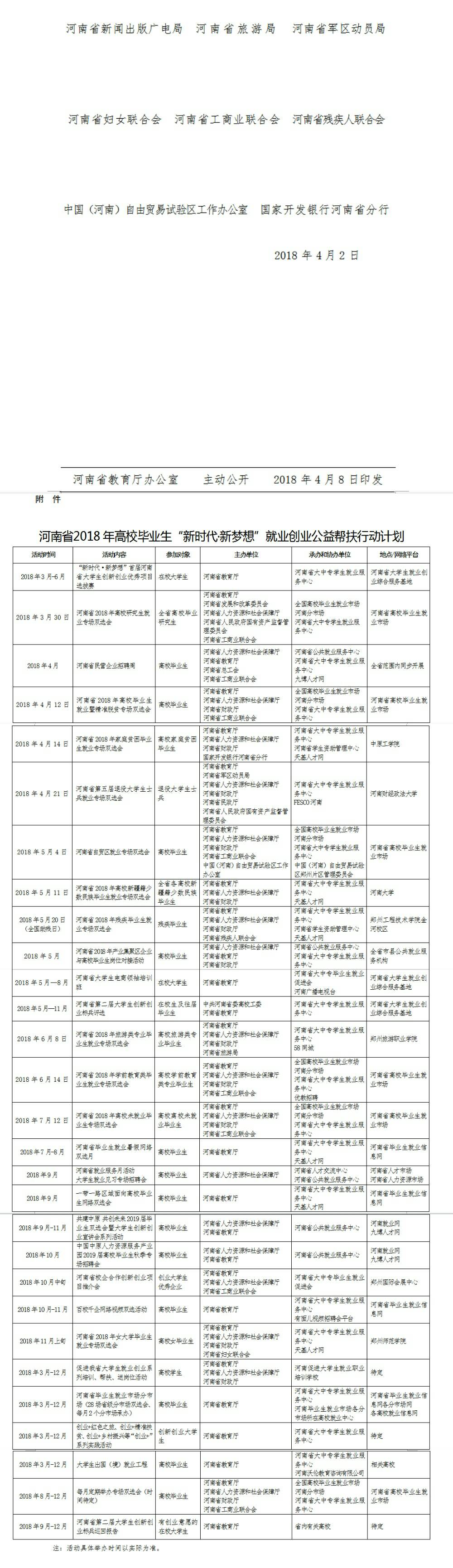 河南省教育厅等十四部门关于联合开展河南省2018年高校毕业生“新时代·新梦想”就业创业公益帮扶行动的通知