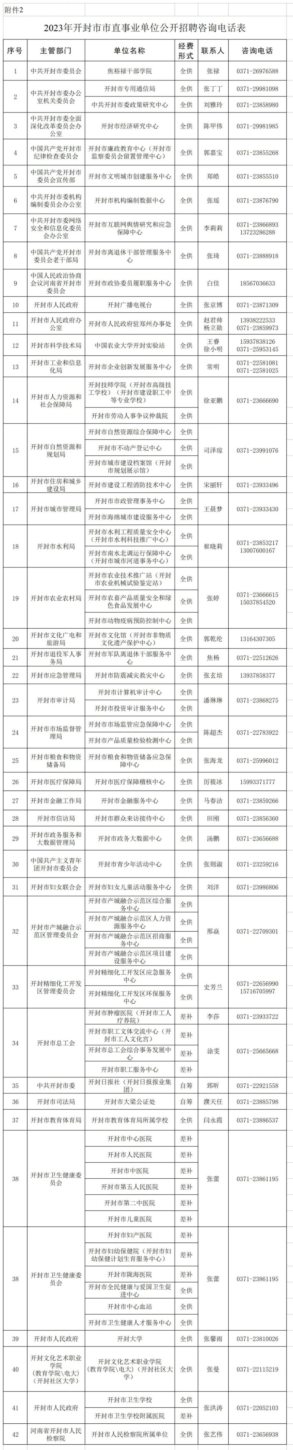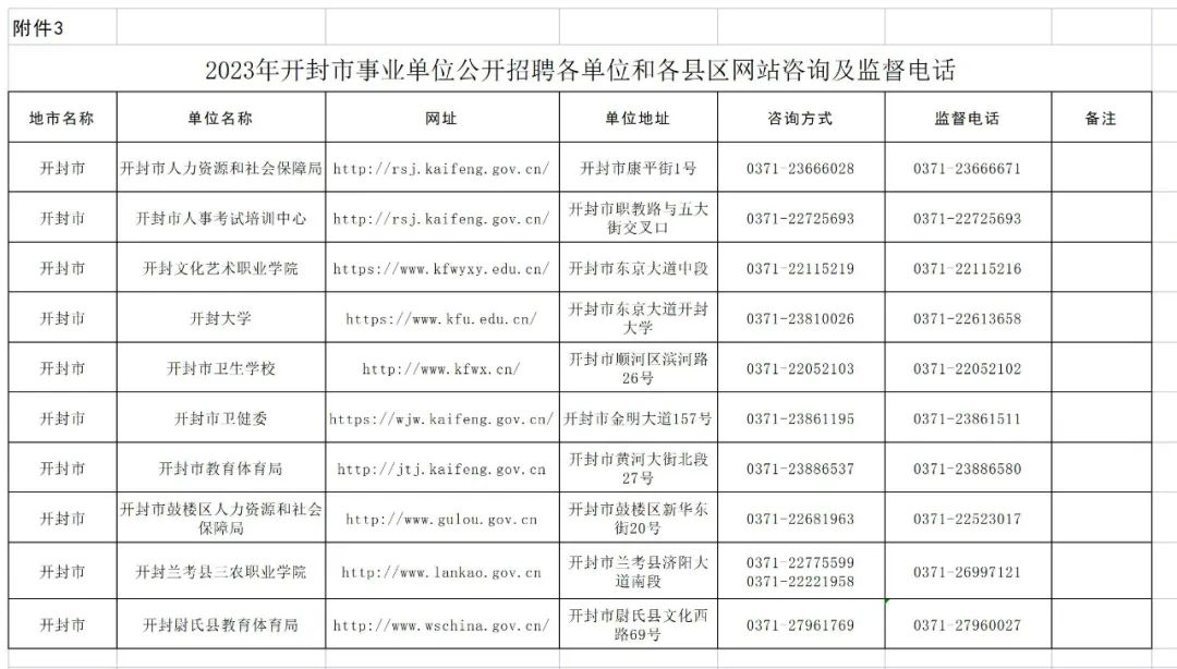 各岗位政策咨询及监督电话:详见《2023年开封市市直事业单位公开招聘咨询电话表》《2023年开封市事业单位公开招聘各单位和各县区网站咨询及监督电话》所附电话。