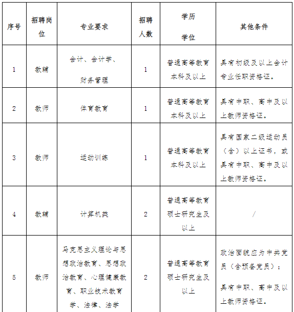 本次公开招聘计划招聘人员9名,其中硕士研究生6名,本科及以上学历3名。具体专业及人数要求详见《河南省民族中等专业学校公开招聘工作人员一览表》(附件1)。