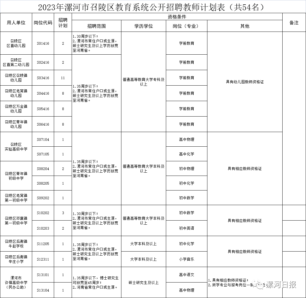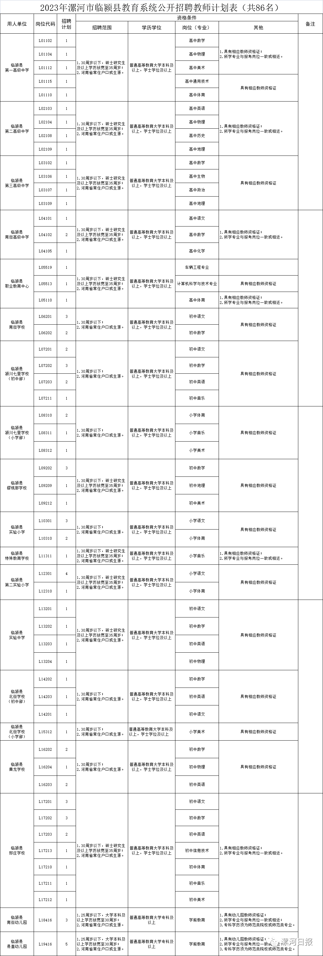 根据人员编制空缺和工作需要,全市教育系统面向社会公开招聘教师584名,其中市直201名(含漯河职业技术学院27名,漯河技师学院5名),临颍县86名,舞阳县69名,郾城区128名,源汇区46名,召陵区54名。
