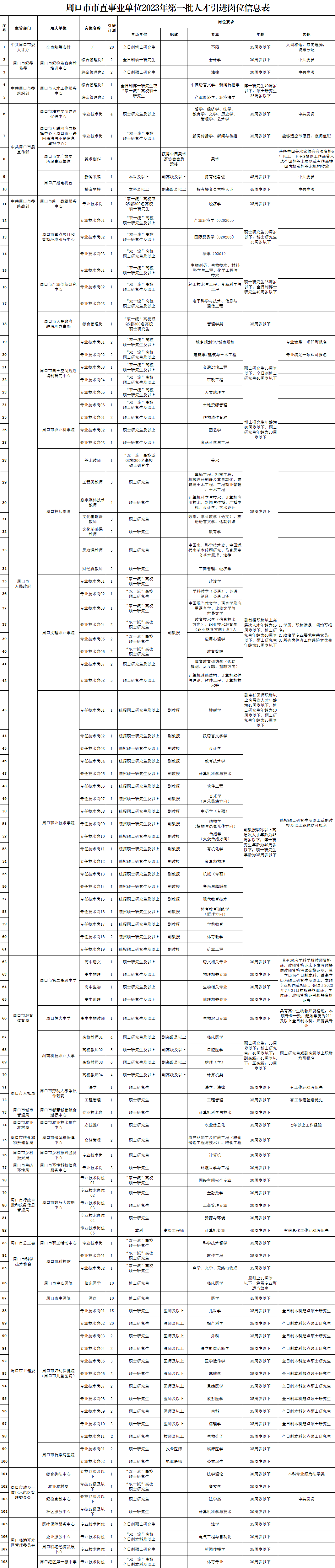 1:周口市市直事业单位2023年第一批人才引进岗位信息表