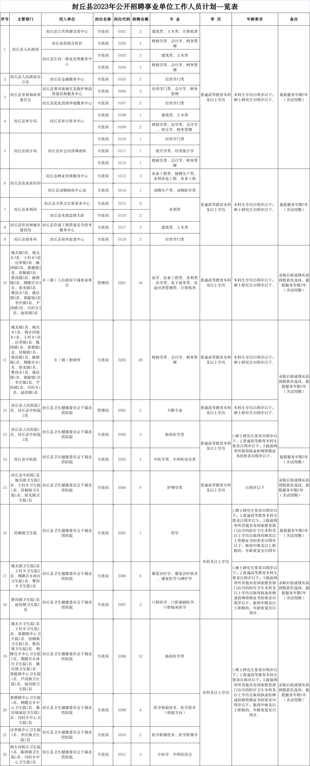 具体招聘单位、岗位、人数及岗位条件等内容详见《封丘县2023年公开招聘事业单位工作人员计划一览表》(附件1)。