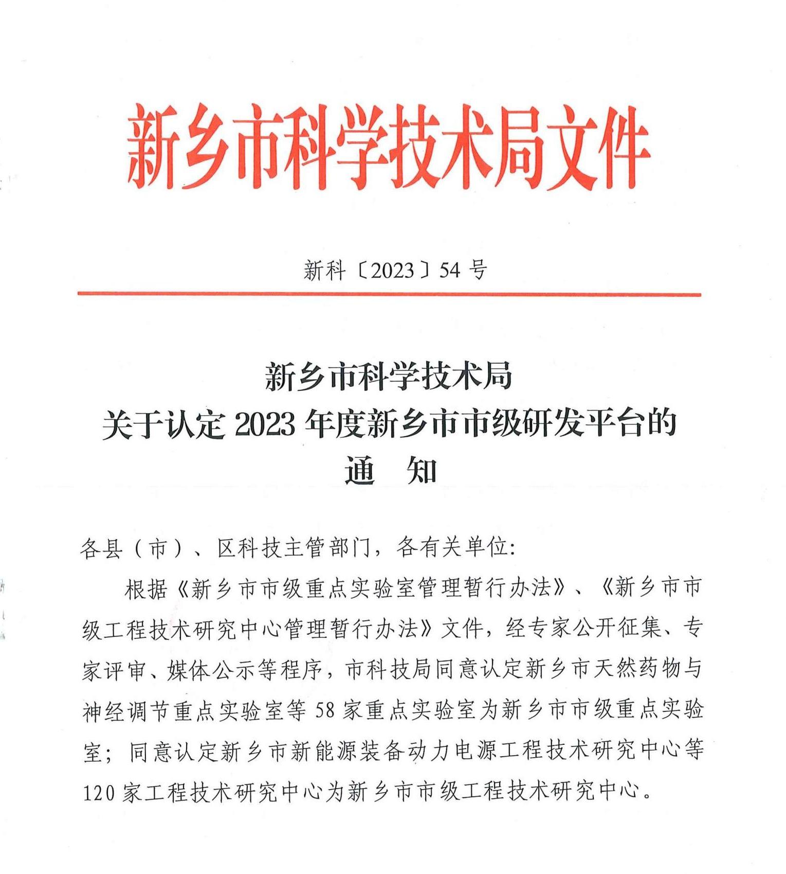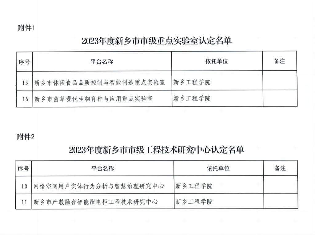 近日,新乡市科学技术局公布了《关于认定2023年度新乡市市级研发平台的通知》(新科【2023】54号),我校申报的四个新乡市研发平台获批立项。分别是:“新乡市休闲食品品质控制与智能制造重点实验室”、“新乡市菌草现代生物育种与应用重点实验室”、“网络空间用户实体行为分析与智慧治理研究中心”和“新乡市产教融合智能配电柜工程技术研究中心”。四个研发平台分别依托于我校食品工程学院、生物工程学院、信息工程学院和机电工程学院建设,实现了我校工科学院市级研发创新平台建设的全覆盖。