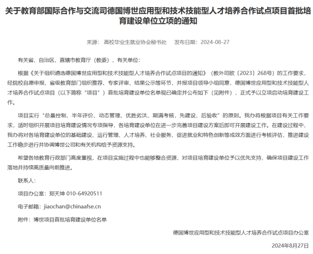 此次入选是依据教育部《关于组织遴选德国博世应用型和技术技能型人才培养合作试点项目的通知》(教外司欧〔2023〕268号)以及相关申报遴选工作的要求,通过院校申报、省级教育部门推荐、专家评审,并经项目领导小组的一致同意。全国范围内,首批培育建设单位共80个(项目88个),其中本科院校占据36席,我校为河南省唯一入选的本科高校。