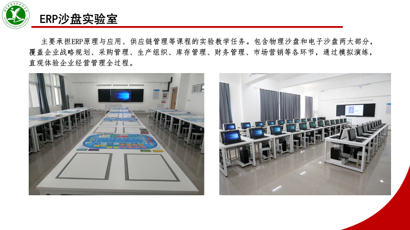 ERP沙盘实验室又称企业资源计划沙盘实验室。覆盖企业战略规划、采购管理、生产组织、库存管理、财务管理、市场营销等各环节,通过模拟演练,直观体验企业经营管理全过程。主要承担ERP原理与应用、供应链管理等课程的实验教学。