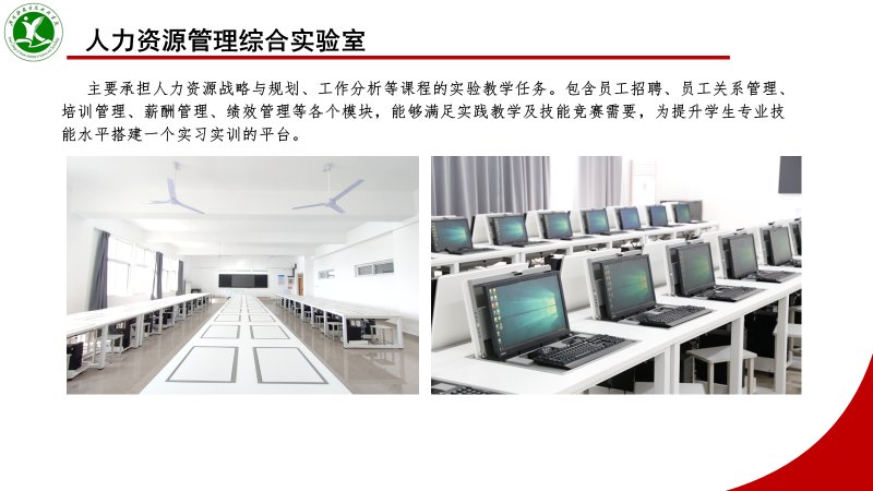 人力资源管理综合实验室针对专业课程特点,融入员工招聘、员工关系管理、培训管理、薪酬管理、绩效管理等模块,全方位满足实践教学及学生实训需要,为学生搭建一个充分发展的平台。主要承担人力资源战略与规划、工作分析等课程的实验教学。