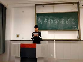 会议伊始,学习部副部长韩振阳点明了此次座谈会的主题。随后,各班学委积极讨论教学情况,并依次上台发言,对任课教师的教学方法及存在问题提出看法和建议。同时,也表达了对老师教学工作的满意。最后,学习部副部长对发言的同学给予肯定,并表示此次会议的讨论意见将会向各科教师反映。