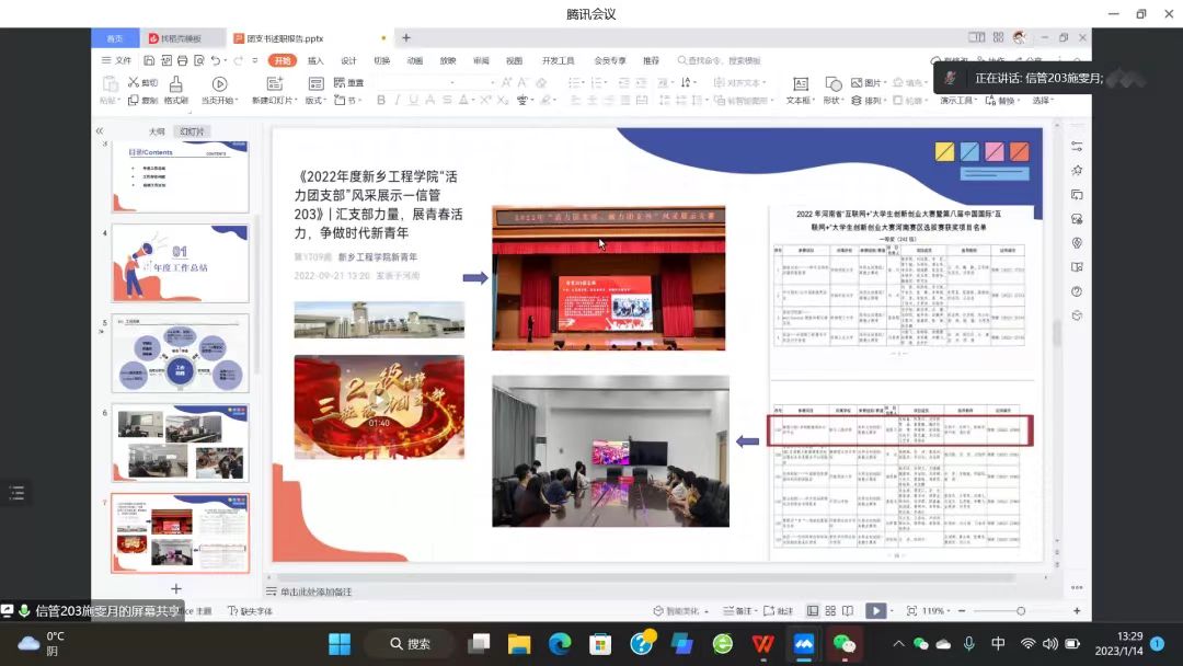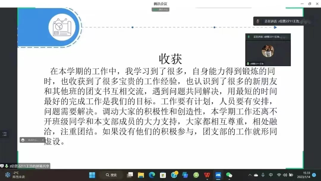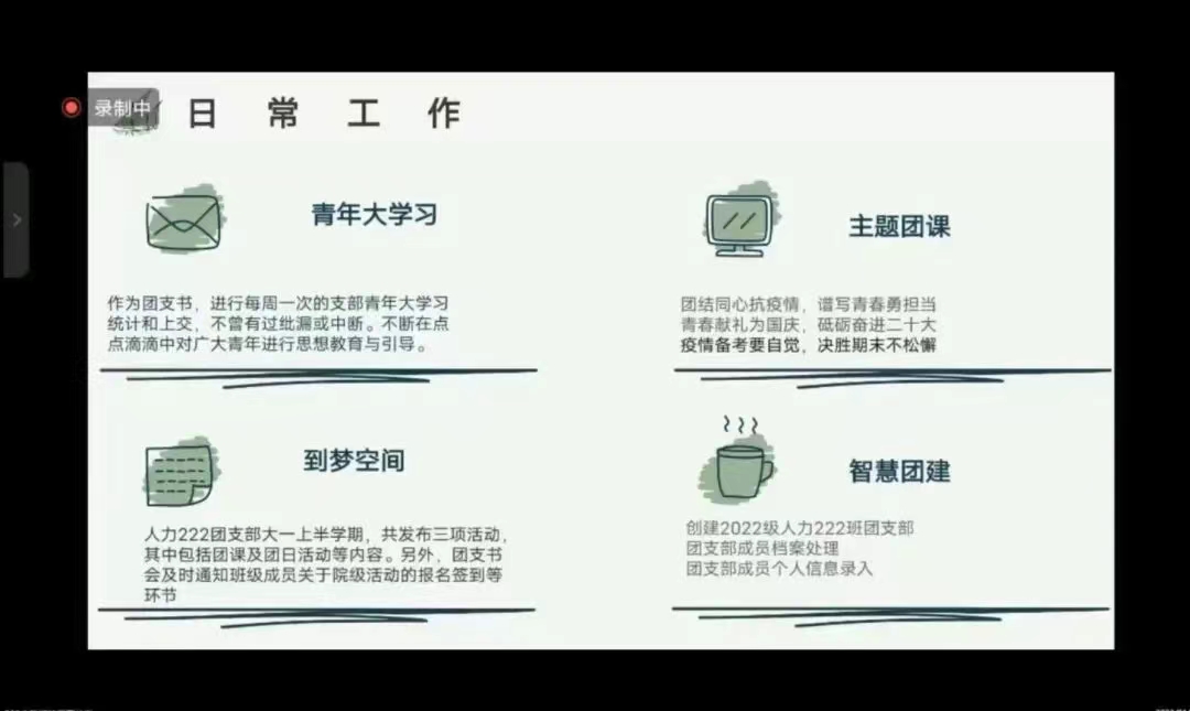 为进一步提高经管学院各团支部的工作能力,推进团支部的建设。2023年1月14日,经管学院通过腾讯会议召开团支书线上述职考核会议。此次19级、20级会议由组织部部长李鹏祥主持,21级、22级会议由组织部副部长张婕妤主持,各班团支书准时参加会议并依次作出工作汇报。