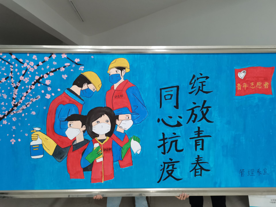 展板寓意:蓝色是海的颜色代表着宁静,清晰象征着自由,我们这副画的底板采用的就是这种颜色,给人一种心情放松的感觉,我们的抗疫正在走向胜利,我们美好的生活正向我们走来 ,樱花的话语是生命之美,樱花是纯洁,文静的寓意,象征着希望,花瓣随风起舞给人一种梦幻美妙之感,这副画中的五个人,前面三个是我们青年一辈的象征他们身穿志愿者的衣服把我们的青春绽放的更加精彩更加优秀,上面的俩位工人他们也是志愿者的象征,他们都有一个目标共同抗疫,红色有一种积极,热情有斗志的寓意,鼓励更多年轻一代进行抗疫绽放青春,红旗飘飘迎接胜利即将到来的一天,和平鸽是友谊,团结,和平的象征,也是我们所有人共同的愿望。