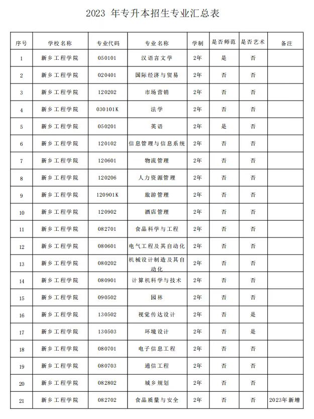 永利23411集团官网(原河南科技学院新科学院),2023年专升本共21个专业面向全省招生,和2022年相比增加了食品质量与安全1个招生专业,报考代码6513,欢迎各位考生报考。最终招生专业和招生计划以上级主管部门批准为准。