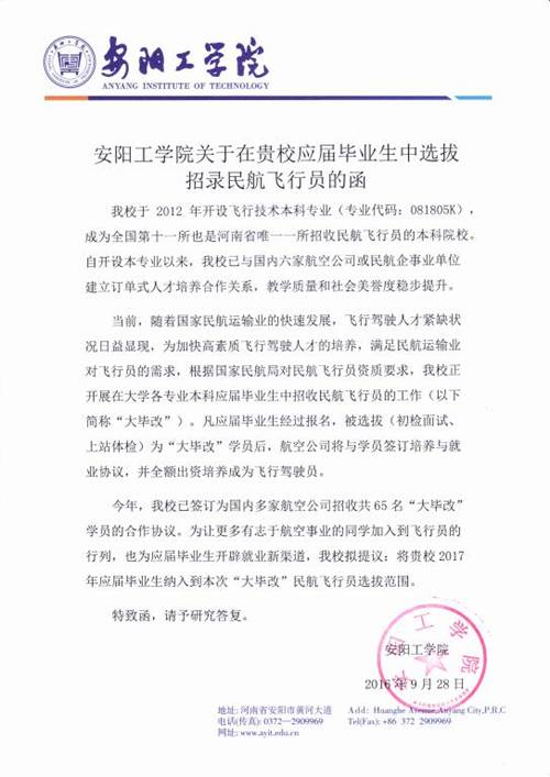 安阳工学院关于公费培养民航飞行员选拔招录的通知