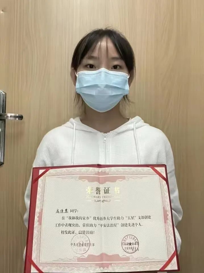 凭借在社会实践中优异的表现,高佳慧同学荣获助力“平安法治星”创建先进个人。本次社会实践中,高佳慧同学积极参与,将在学校所学知识与技能在社会实践中运用,使自身能力得到了实际的提升。