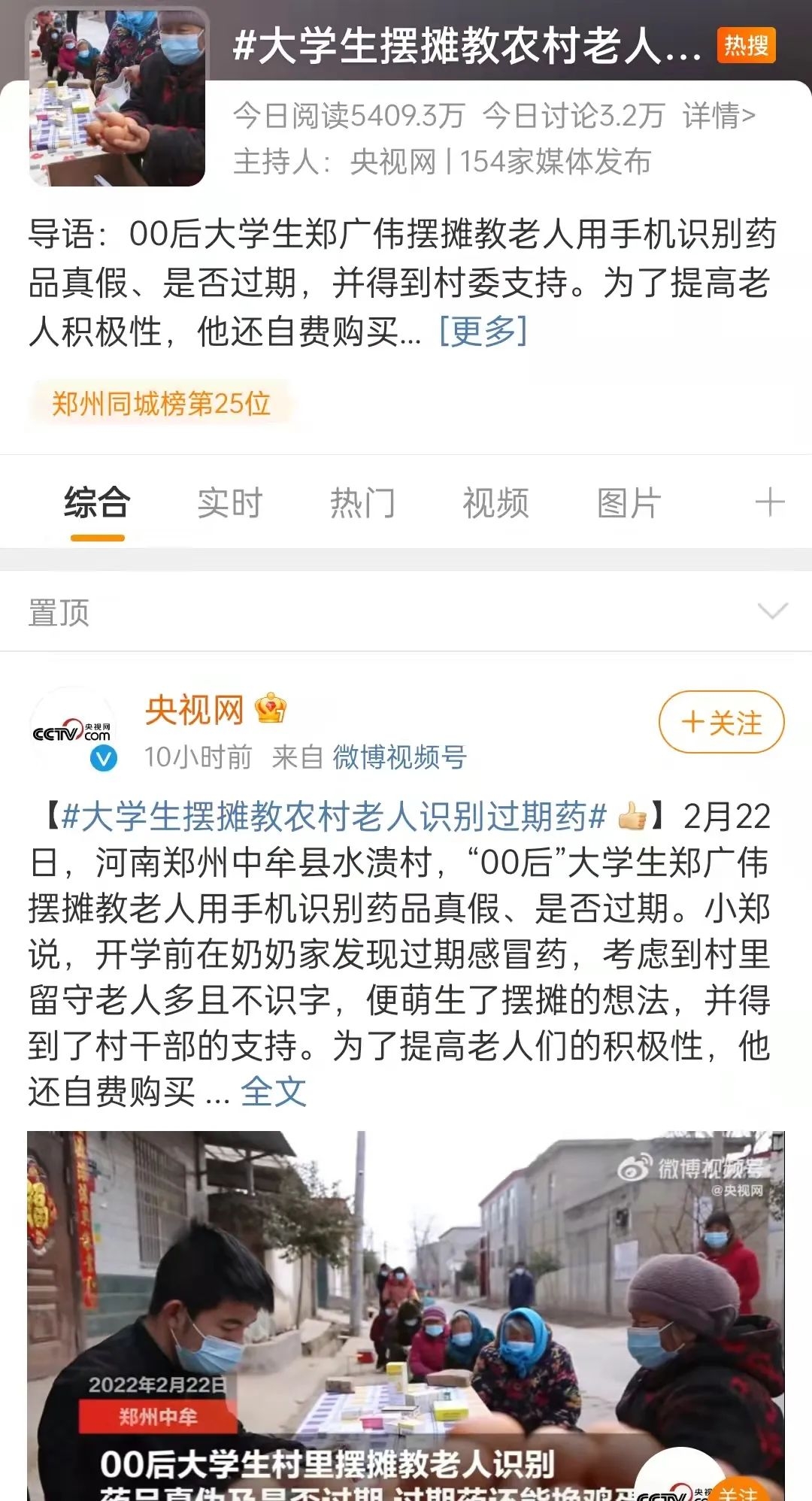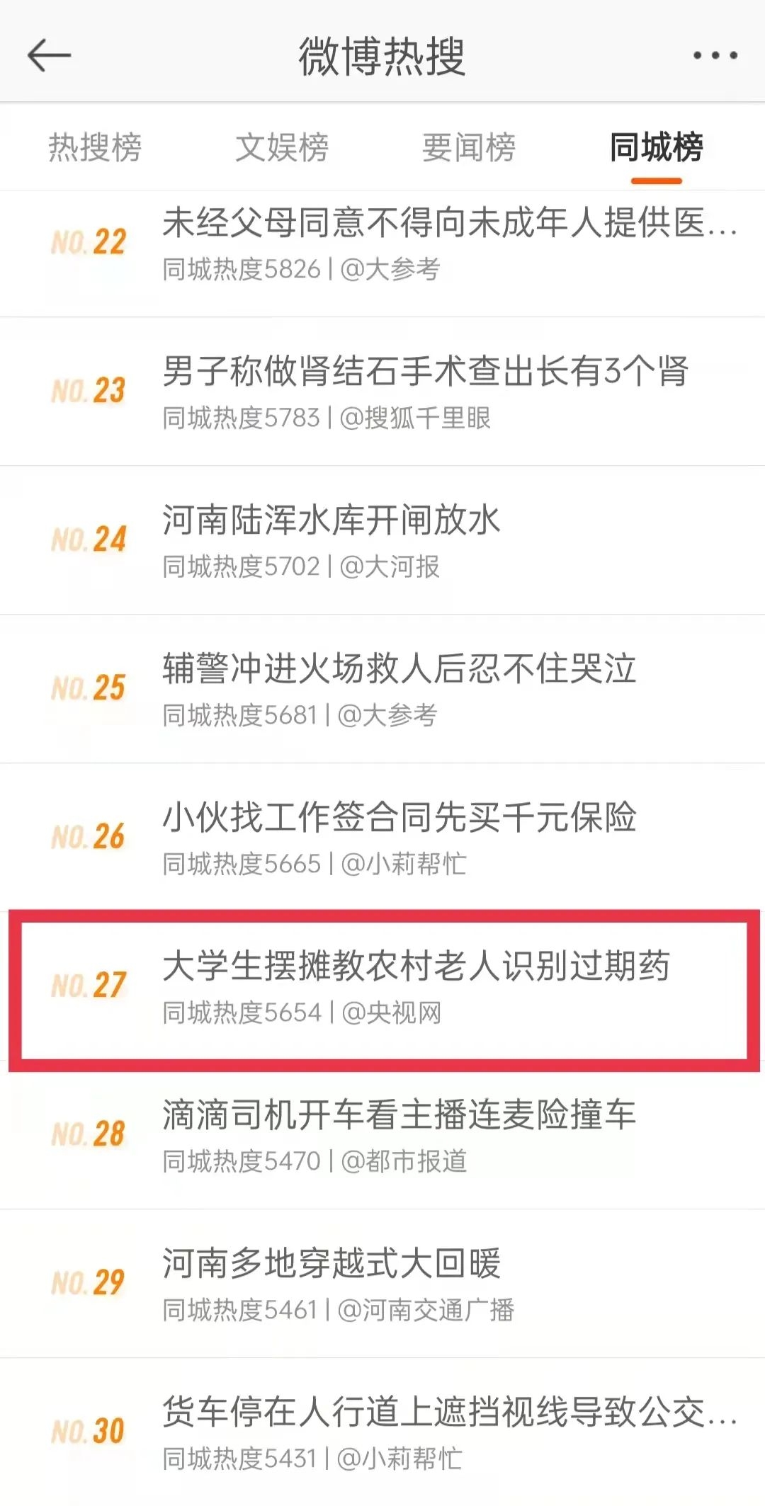 据了解,郑广伟同学开学前在奶奶家发现过期感冒药,考虑到村里留守老人多且不识字,便萌生了摆摊的想法,并得到了村干部的支持。为了提高老人们的积极性,他还自费购买了几十斤鸡蛋兑换过期药,受到央视网微博的特别关注后,话题为“大学生摆摊教农村老人识别过期药”受到网友热议、点赞,随后持续上温,阅读人次超5409多万,点赞数超2万,讨论次数超3万,150余家媒体转载发布。