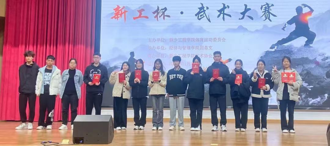 为展现当代大学生的青春风采,弘扬中华民族优秀的武术文化,我校于2022年11月12日在第一报告厅举办以“武动新工,术展自我”为主题的武术比赛,本次比赛由校体育运动委员会主办、经济与管理学院团总支承办、武术协会协办。