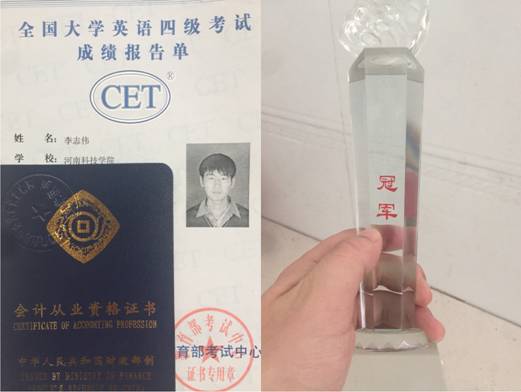 他从来不放松自己,在平时的学习生活中努力的要求自己,不断的提高自己,使自己的专业领域得到更广泛的发展。经过长时间的努力,他的专业知识以及各方面技能都有了很大突破。在大学期间,成绩始终名列前茅,三次获得国家励志奖学金,八次获得校内奖学金,并考取了英语专业水平证书和会计资格证书。