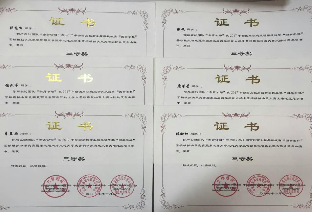 近日,2017年全国高校商业精英挑战赛“国泰安杯”流通业经营模拟竞赛暨第四届两岸三地大学生流通业经营模拟大赛”大陆地区总决赛圆满落幕,经过总决赛的激烈角逐,管理系代表队获三等奖。