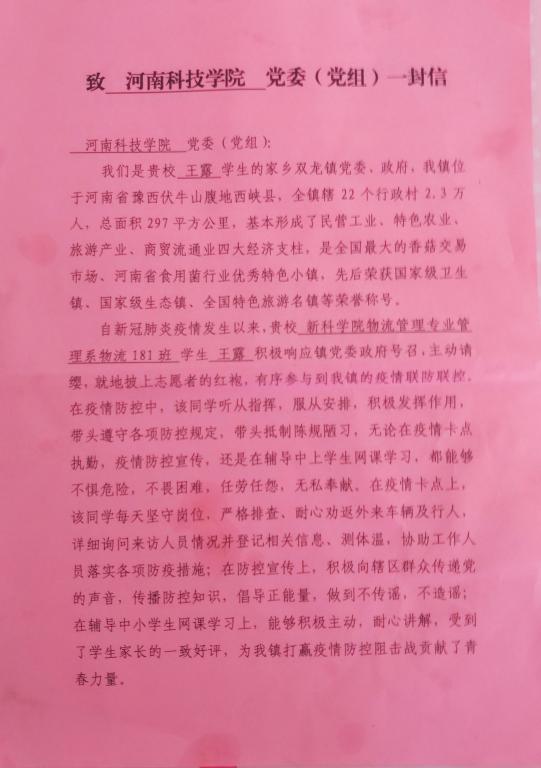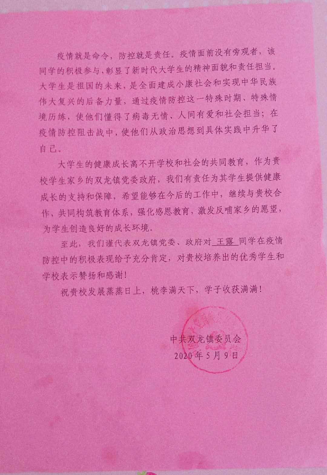 近日,我系收到一封来自南阳市西峡县双龙镇镇委发来的一封信。信中对我系2018级王露同学提出表扬,对她在抗击疫情期间所做出的努力表示感谢。