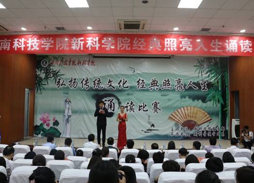 5月29日下午3点,新科学院教务部主办,新科学院管理系承办的第四届“经典照亮人生”教师组朗诵比赛在图书馆一楼报告厅隆重举办。新科学院院领导刘鸣韬、张传来 张宝剑、姚素梅、熊仁杰出席并担任本次比赛评委老师。近300余名师生共同观看了比赛。