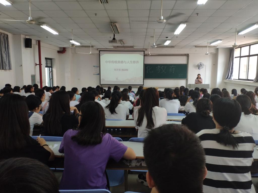 为进一步提升我校大学生人文素养,探讨中华传统美德对大学生人生修养的启示,9月11日上午8点于12号楼合七教室,经济系副主任魏淑敏为我系18级新生做了主题为《中国传统美德与人生修养》。