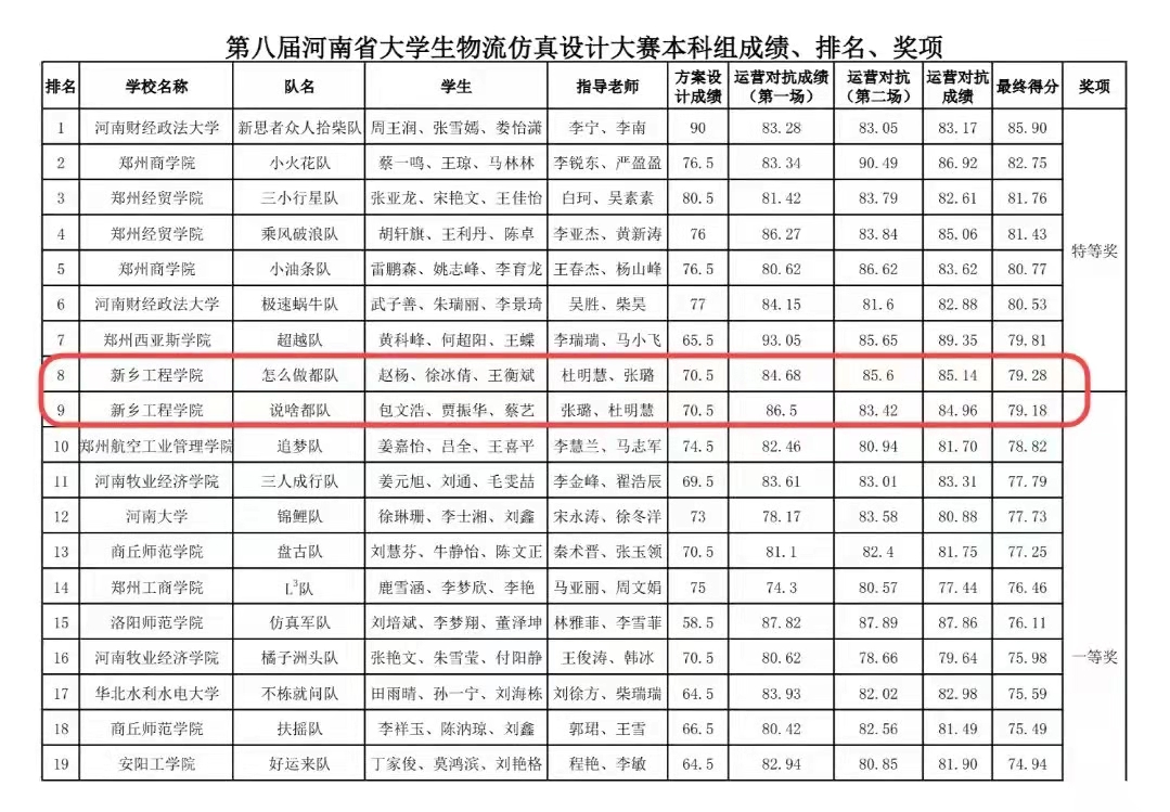 11月13日,第八届河南省大学生物流仿真设计大赛在百蝶在线学习平台隆重举行。本次比赛由河南省物流协会主办,郑州工商学院承办,河南省普通高等学校物理管理与工程类专业教学指导委员会指导,上海百蝶教育科技有限公司、河南省产教融合规划研究院、河南新世纪拓普电子技术有限公司提供技术支持。我校经济与管理学院物流管理专业派出两个代表队参加本次比赛,由张璐,杜明慧二位老师担任指导教师。经过赛场上激烈的角逐,“怎么都队”赵杨,徐冰倩,王衡斌三位同学荣获特等奖,“说啥都队”包文浩,贾振华,蔡艺三位同学荣获一等奖,经管学院荣获优秀组织奖。