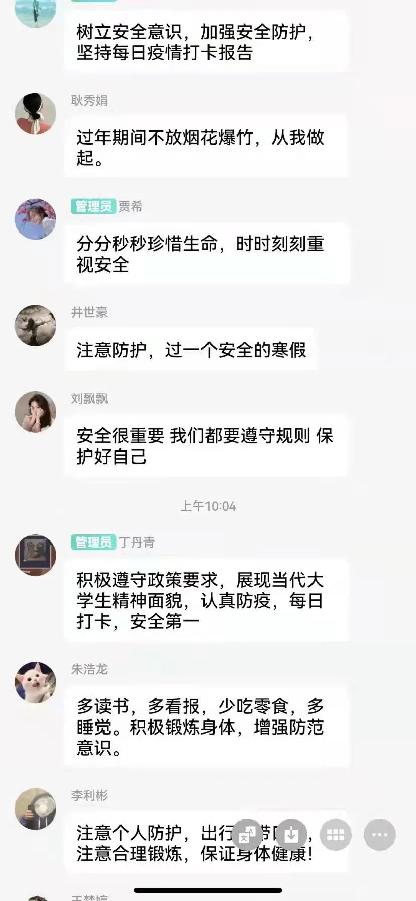 会议中,老师强调同学们在寒假中要注意疫情防控的各项要求,落实“日报告”“零报告”“钉钉打卡”制度,如实向辅导员报告自身健康状况。谈到日常生活,老师们着重提到日常安全、提醒同学们要加强交通、防火、防盗等安全知识,尤其新春将至,为了持续改善空气质量,推动文明城市建设,禁燃禁放烟花爆竹。最后,老师们特别叮嘱大家牢固树立“生命至上、安全第一”的意识,度过一个平安的、愉快的假期。至此,本次会议圆满结束。
