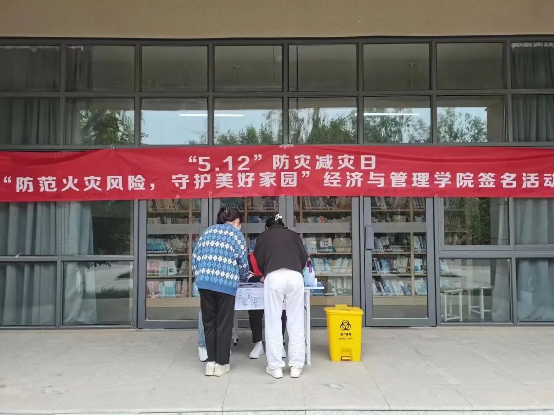 2022年5月12日为我国第十四个全国防灾减灾日,为进一步强化同学们防范灾难的意识,提高抵御灾害的能力,经济与管理学院于5月12日下午在教学楼2图书馆南侧举行以“防范火灾风险,守护美好家园”为主题的防灾减灾日签名活动,经管学院学生积极参与。