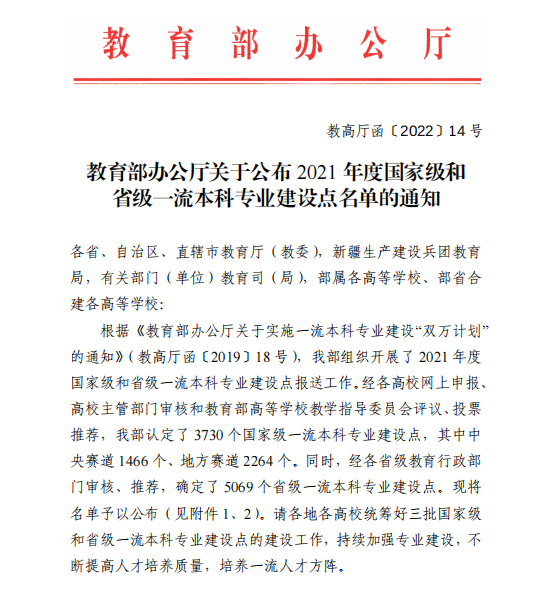 近日,教育部办公厅下发《关于公布 2021 年度国家级和省级一流本科专业建设点名单的通知》(教高厅函〔2022〕14 号)文件,我院信息管理与信息系统专业获批2021年度河南省一流本科专业建设点。