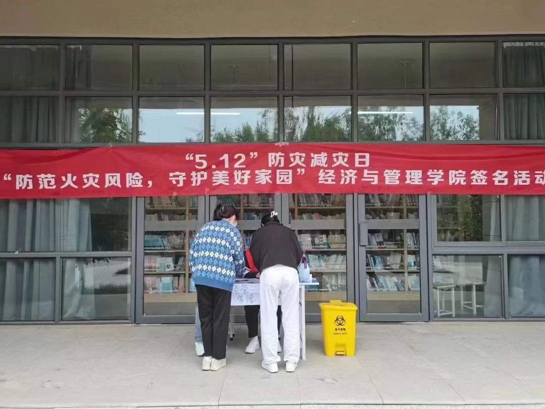 2022年5月12日为我国第十四个全国防灾减灾日,为进一步强化同学们防范灾难的意识,提高抵御灾害的能力,经济与管理学院于5月12日下午在教学楼2图书馆南侧举行以“防范火灾风险,守护美好家园”为主题的防灾减灾日签名活动,经管学院学生积极参与。