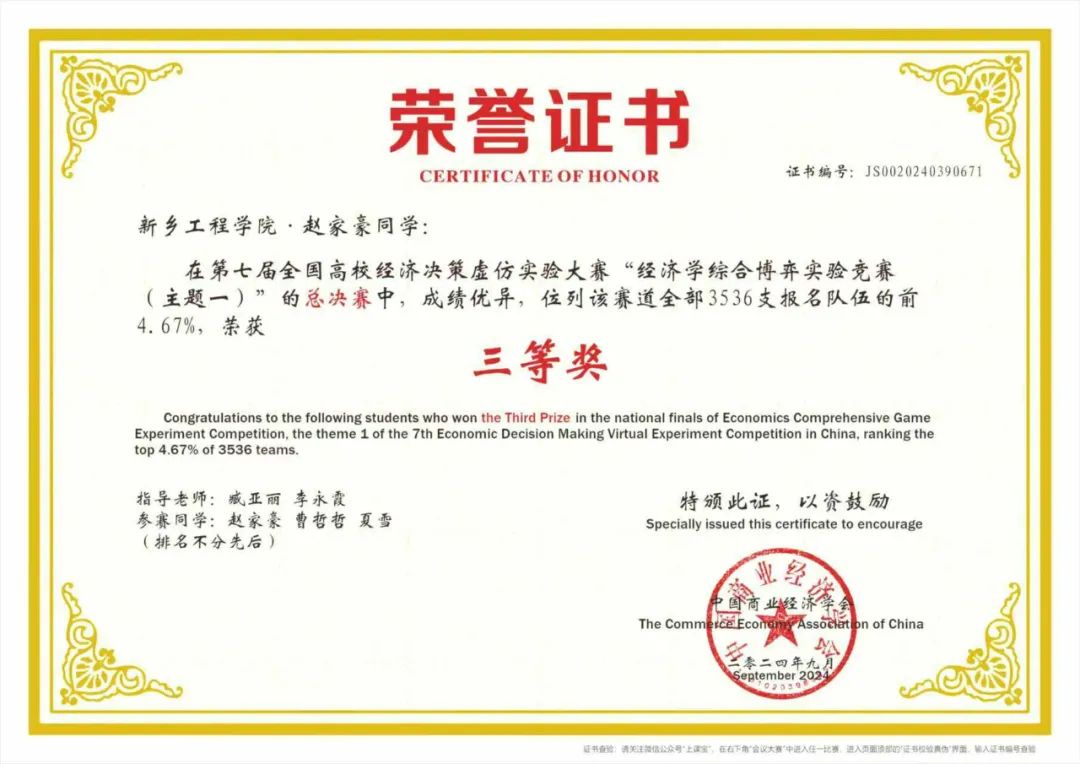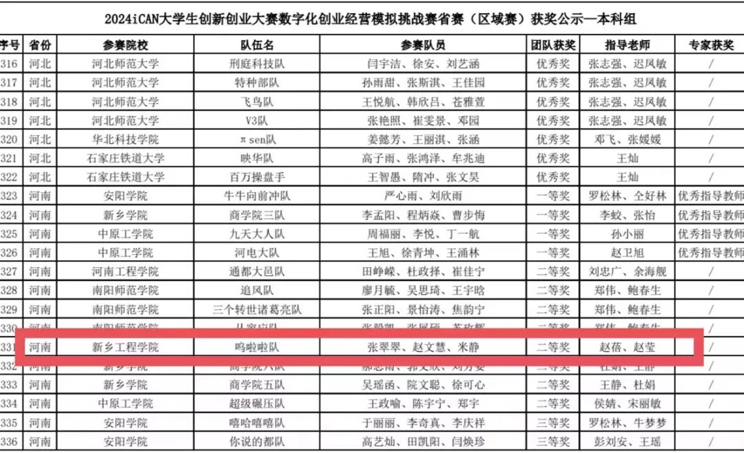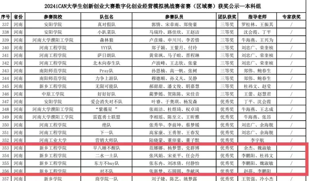 喜讯:赵莹老师、杜祎文老师、赵蓓老师、余杰老师、魏淑敏老师、李鹏阳老师指导的学生团队在2024iCAN大学生创新创业大赛数字化创业经营模拟挑战赛省赛(区域赛)中喜获二等奖与优秀奖。
