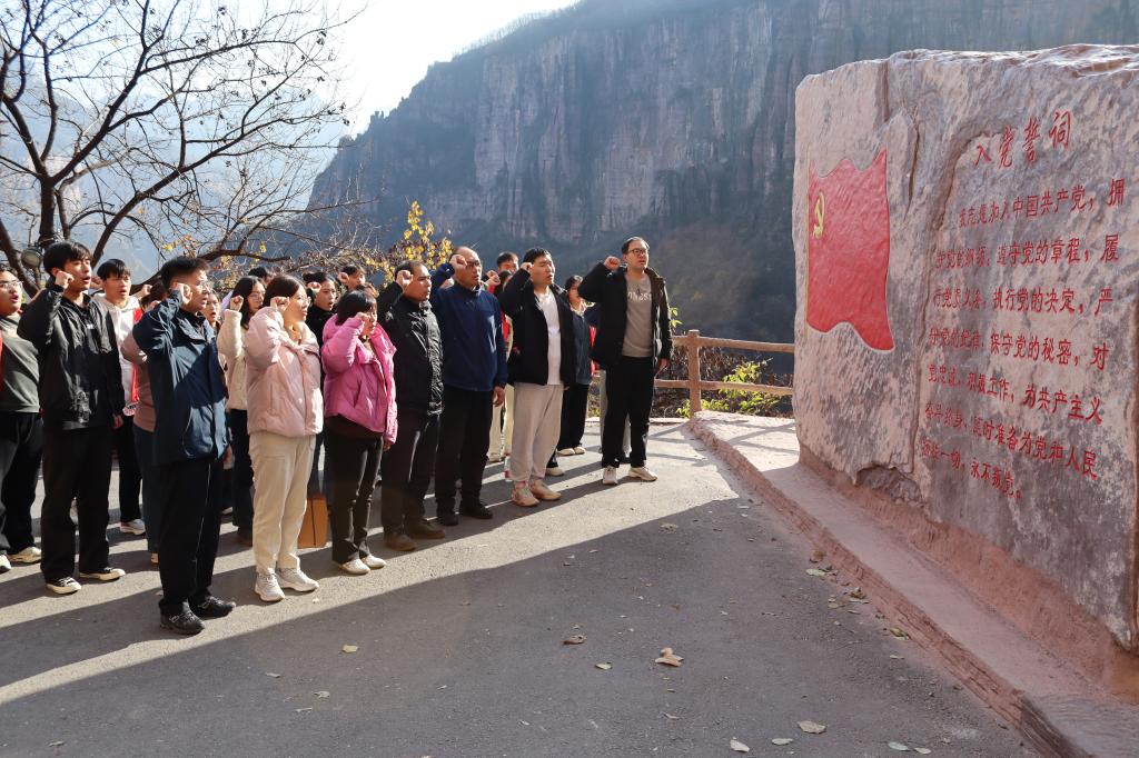 此次主题党日活动在绝壁长廊入口处展开。在这个充满革命气息的地方,团委书记王康担任领誓人,庄重地带领全体成员共同宣读入党誓词。一句句誓言,回荡在太行山间,也在每位党员心中激起强烈的爱国情感和崇高的革命精神的浪花。