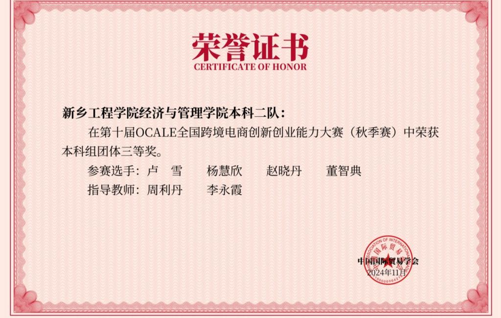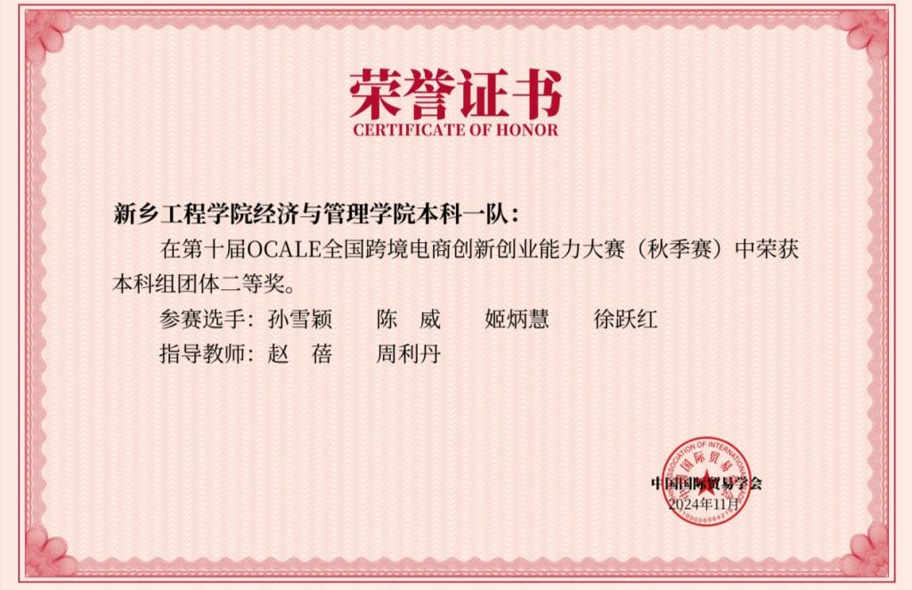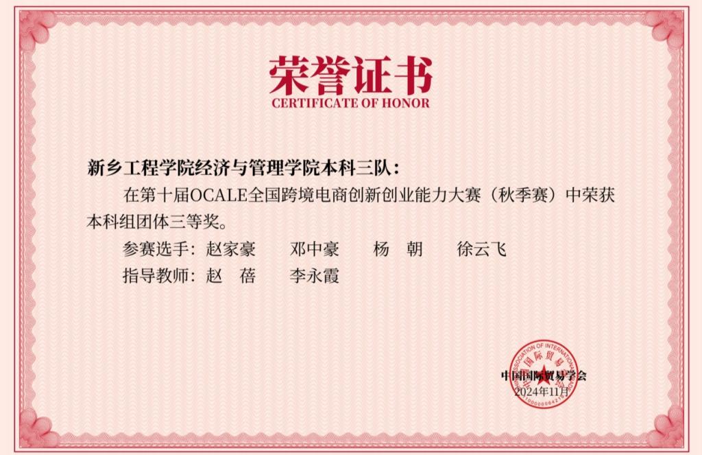2024年11月28号,中国国际贸易学会举办的第十届OCALE全国跨境电商创新创业能力大赛(秋季赛)落下帷幕。本次大赛共有2689支参赛队参加了此次比赛,其中本科组1662支。我院参赛团队在指导教师的指点下经历了两轮练习,于11月26号-28号期间进行了12个回合的角逐,最终学生团队斩获二等奖1项,三等奖5项。