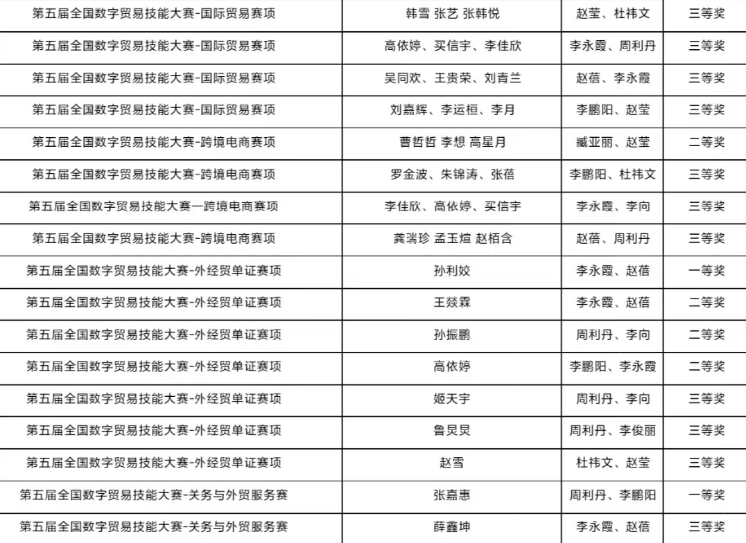 近日,由中国对外贸易经济合作企业协会主办的第五届数字贸易技能大赛落下帷幕,比赛共下设四个赛项,分别是国际贸易赛项、跨境电商赛项、外经贸单证赛项和关务与外贸服务赛项。我院在此次比赛,国际贸易赛项荣获四个三等奖;跨境电商赛项荣获一个二等奖、三个三等奖;外经贸单证赛项荣获一个一等奖、三个二等奖、三个三等奖;关务与外贸服务赛项荣获一个一等奖、一个三等奖。