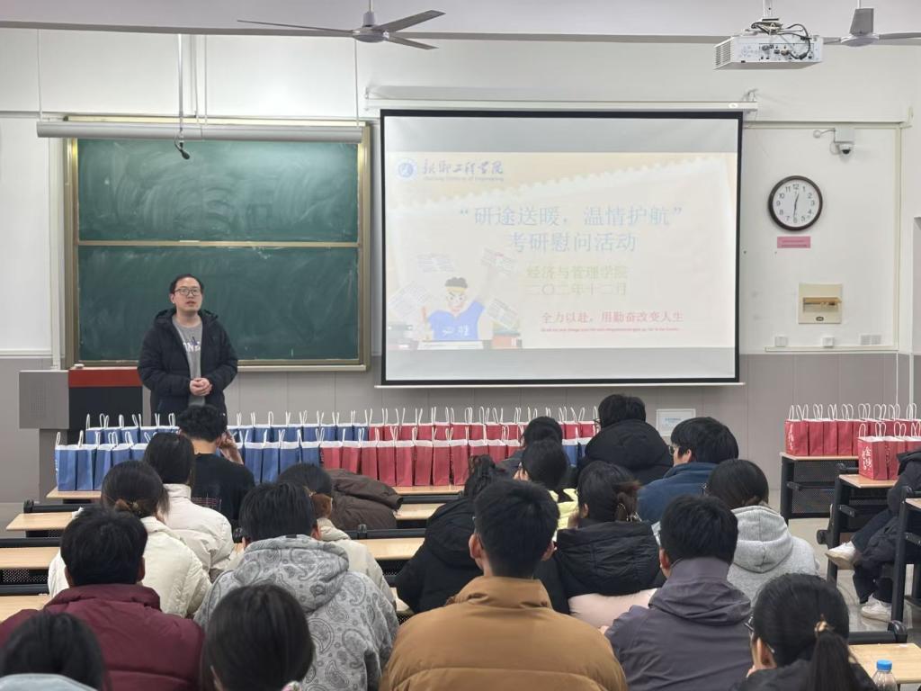 为了给予考研同学鼓励与支持,12月9日中午,经济与管理学院在学院楼B203举行考研人员慰问品发放仪式,为考研学子送上真挚的祝福和支持。此慰问活动由我院团委书记王康主持,教务办公室主任肖广来、辅导员李华、赵润、关光辉、高浩恩、李萌萌以及我院全体考研学子参加。活动现场气氛热烈,充满了温馨与感动。