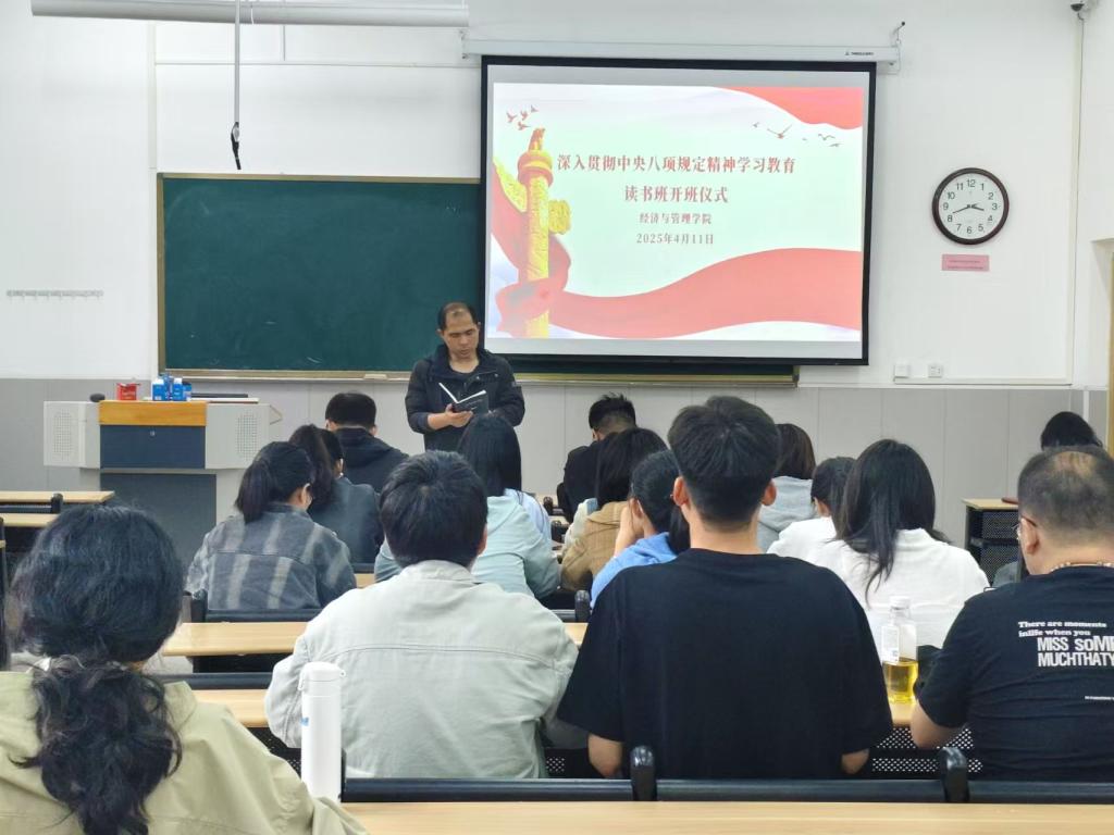 为深入贯彻落实中央八项规定精神,加强党风廉政建设,提升学院教工党员的政治素养和纪律意识,4月11日,经管学院在学院楼B107教室举行了“深入贯彻中央八项规定精神学习教育读书班”开班仪式,学院全体教工党员参加了此次活动。